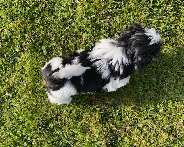 Petit mâle de couleur tricolore (noir, blanc et feu).